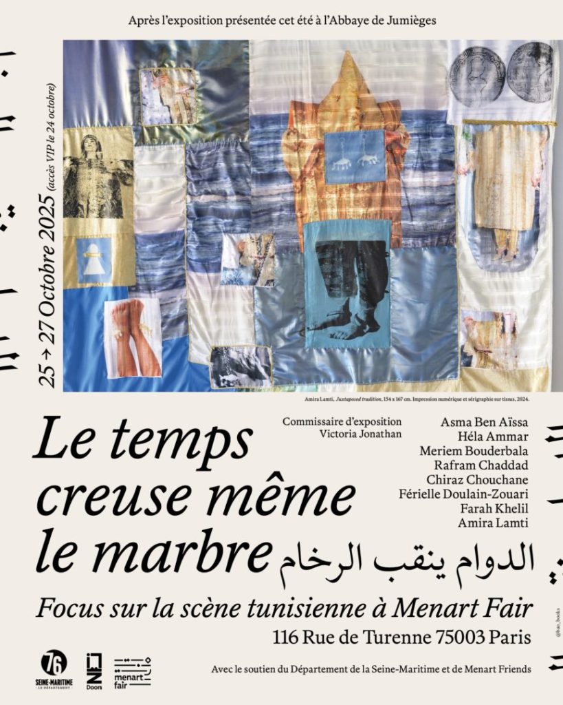 Produced by the Seine-Maritime Department and first presented at the Abbey of Jumièges last summer, the collective exhibitionSlow and Steady Wears the Stone الدوام ينقب الرخام” brings together artists from the contemporary Tunisian scene. For the 6th edition of Menart Fair in Paris, a selection of works is shown beneath the glass roof of a former workshop in the Marais.