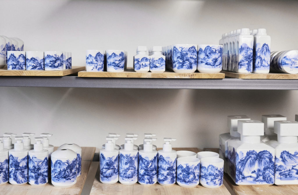 Réalisées dans l’atelier de l’artiste à Jingdezhen, berceau de la céramique, 261 bouteilles en céramique portent chacune un fragment du paysage. Les motifs tirés du rouleau original ont été méticuleusement transférés sur ces formes tridimensionnelles à l’aide d’un bleu cobalt spécialement développé pour cette œuvre, faisant écho à la profondeur et au dynamisme de la peinture traditionnelle chinoise.